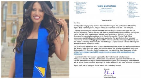 -Svjestan sam da se posjeta desila, ali srećom, ona se nije mogla sastati s prominentnim zvaničnicima. Nadležni imaju pravo da ne izdaju vizu i sankcionišu one koji ugrožavaju mir i ljudska prava te će vaši komentari biti od pomoći prilikom donošenja zakona koji se odnose na američko vanjskopolitičko djelovanje prema Bosni i Hercegovini, zaključio je senator Grassley.