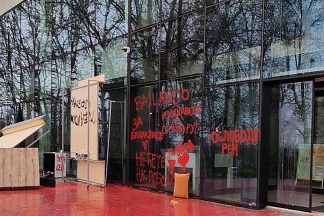 Ulazna vrata zgrade RTV Vojvodine u Novom Sadu jutros su bila meta protesta studenata – gađana su jajima, a na staklima su crvenom farbom ispisane poruke. Plato ispred zgrade ofarban je u crveno, dok su zidovi i staklene površine prekriveni porukama nezadovoljstva.